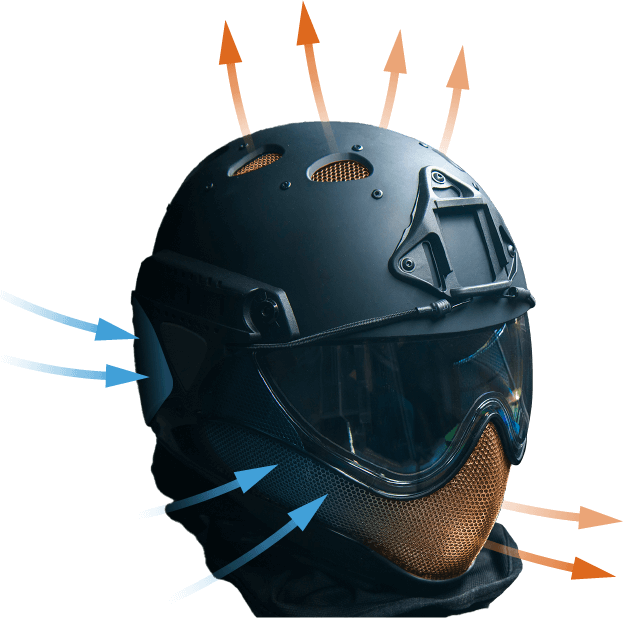 Sistema antivaho de ventilación patentado: Incorpora un eficiente sistema de ventilación que expulsa el aire caliente y el sudor antes de que puedan empañar la pantalla. Esta tecnología AntiFog de alta eficiencia, junto con una amplia mascarilla ventilada, mantiene la visera libre de vaho incluso durante esfuerzos intensos. El operador no necesita interrumpir el ejercicio para limpiar lentes, evitando situaciones peligrosas (como levantar la visera en medio del combate, algo que podría causar lesiones graves).